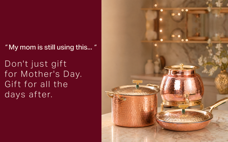 Experience the world of mindful cooking with copper kitchenware that transforms your daily cooking ritual. Our artisan-crafted copper cookware combine stunning aesthetics with unmatched quality. It is made with pure metal, which is a good conductor of heat and naturally nonstick. This ensures that every dish you create is infused with nutrition and flavor. When you choose P-TAL copper cookware online, you're welcoming a legacy of culinary excellence mentioned in Ayurvedic scriptures, hand-hammered by artisans, and cherished by chefs for generations in India.