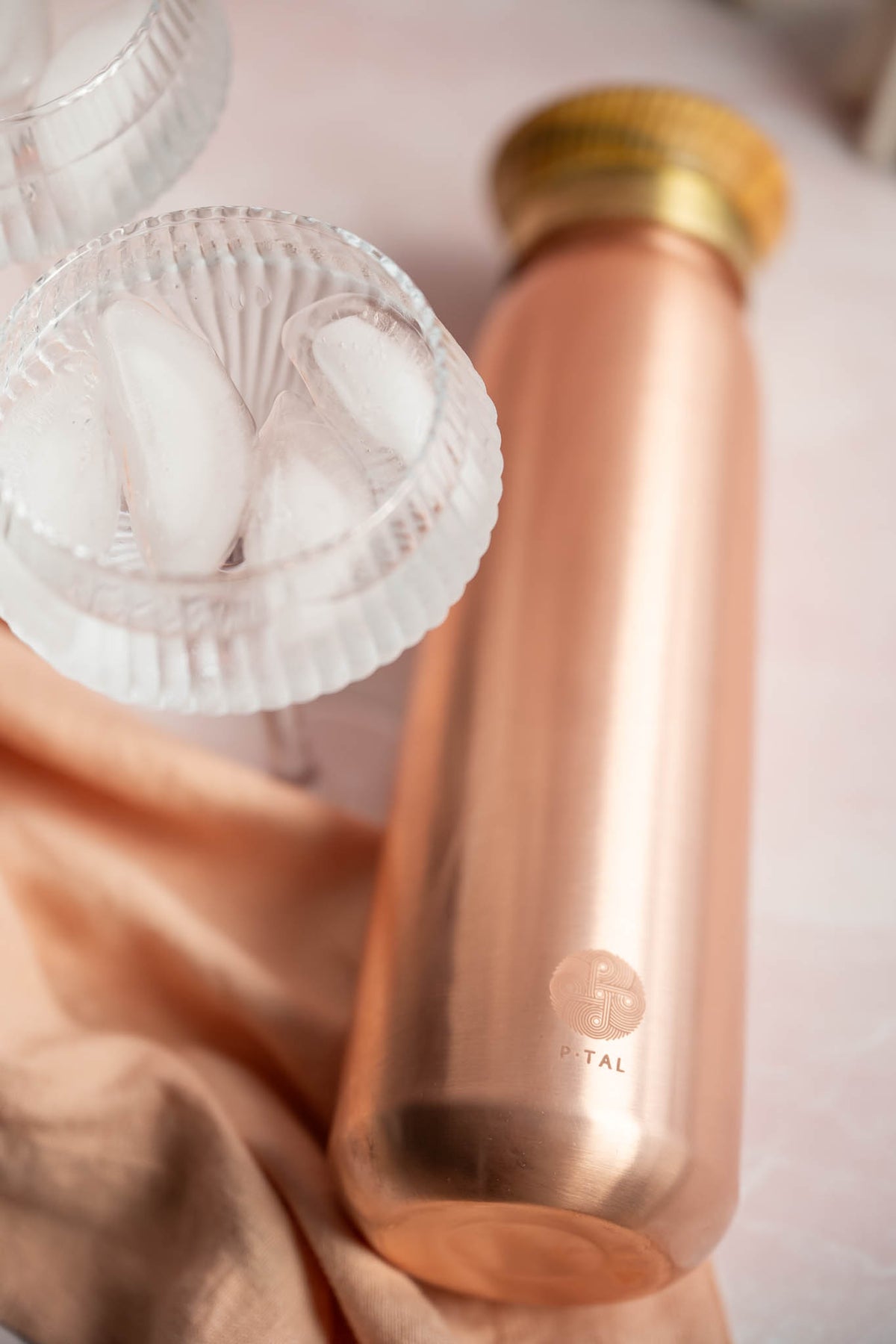 P•TAL’s Copper Water Bottle brings you the benefits of ‘Tamra Jal’ in a design that fits effortlessly into your everyday life. Crafted from pure copper and finished with a wooden leakproof cap, this sleek bottle reintroduces a timeless wellness ritual in a form that’s both functional and beautiful. According to Ayurveda, storing water in copper balances the body's three doshas and enhances iron absorption, pH balance, and immunity. Whether at home, work, or on the move — this is hydration with intention.