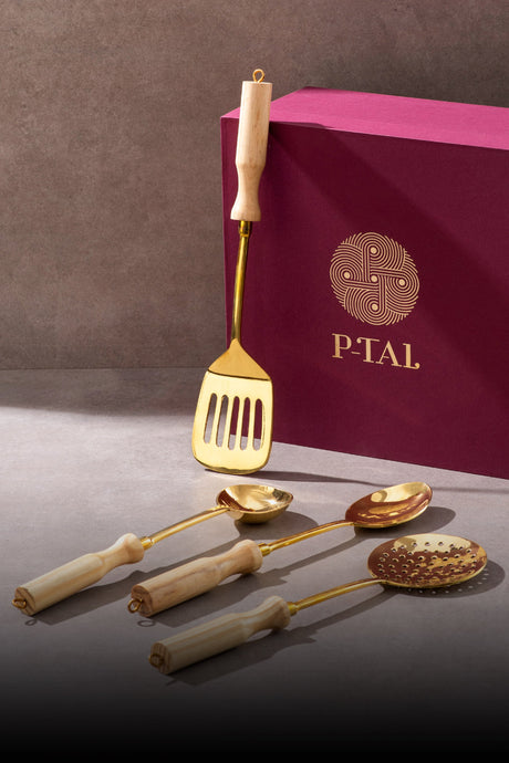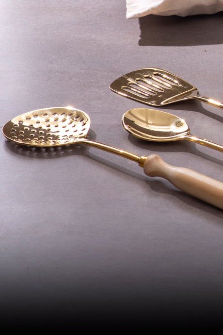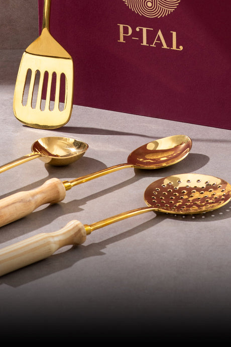 Cook using a classic set of brass utensils that simplify every meal and carry legacy. Designed with a naturally smooth, non-toxic surface for simple stirring, serving, and scooping, this well-built collection comprises a skimmer, serving spoon, scoop ladle, and spatula. This exquisitely crafted set gracefully celebrates utility and legacy in daily cooking and serving.