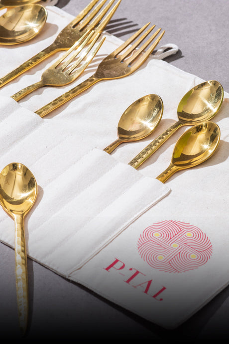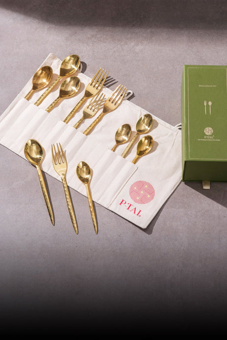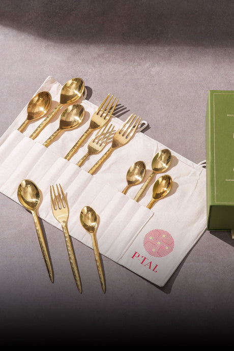 Make every meal feel like a celebration with P-TAL’s Gift Box of Engraved Brass Forks & Spoons. This thoughtfully crafted set of 6 brass forks and 6 brass spoons comes nestled in a rich maroon gift box. It is perfect for festive tables or as a timeless gift. The cutlery is hand-engraved and polished to perfection. It adds a warm, elegant charm to every bite. It ensures to blend in tradition with everyday refinement.