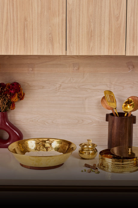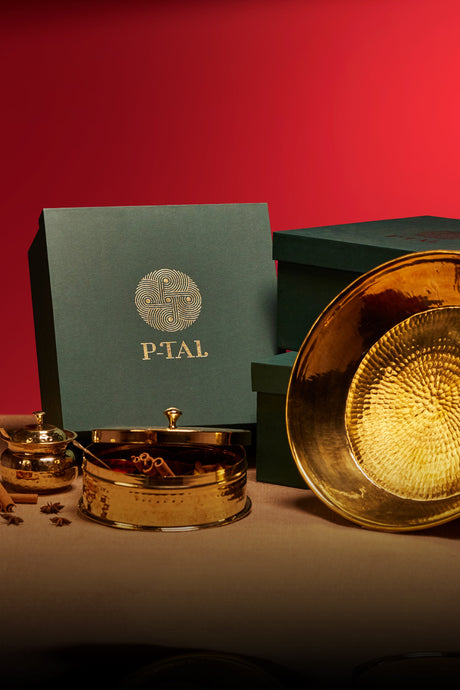 Using P•TAL's Kitchen Essentials Set, honor the unassuming heroes in your kitchen. Combining the classic Paraat, the exquisite Ghee Pot, and the rustic Masala Box, this trio offers form, use, and legacy together in one thoughtful collection. Designed to enhance daily rituals and festive preparations, each handcrafted piece made of pure brass honors the wisdom of a slower, more deliberate life. Beautiful to employ. Much better still to live with.