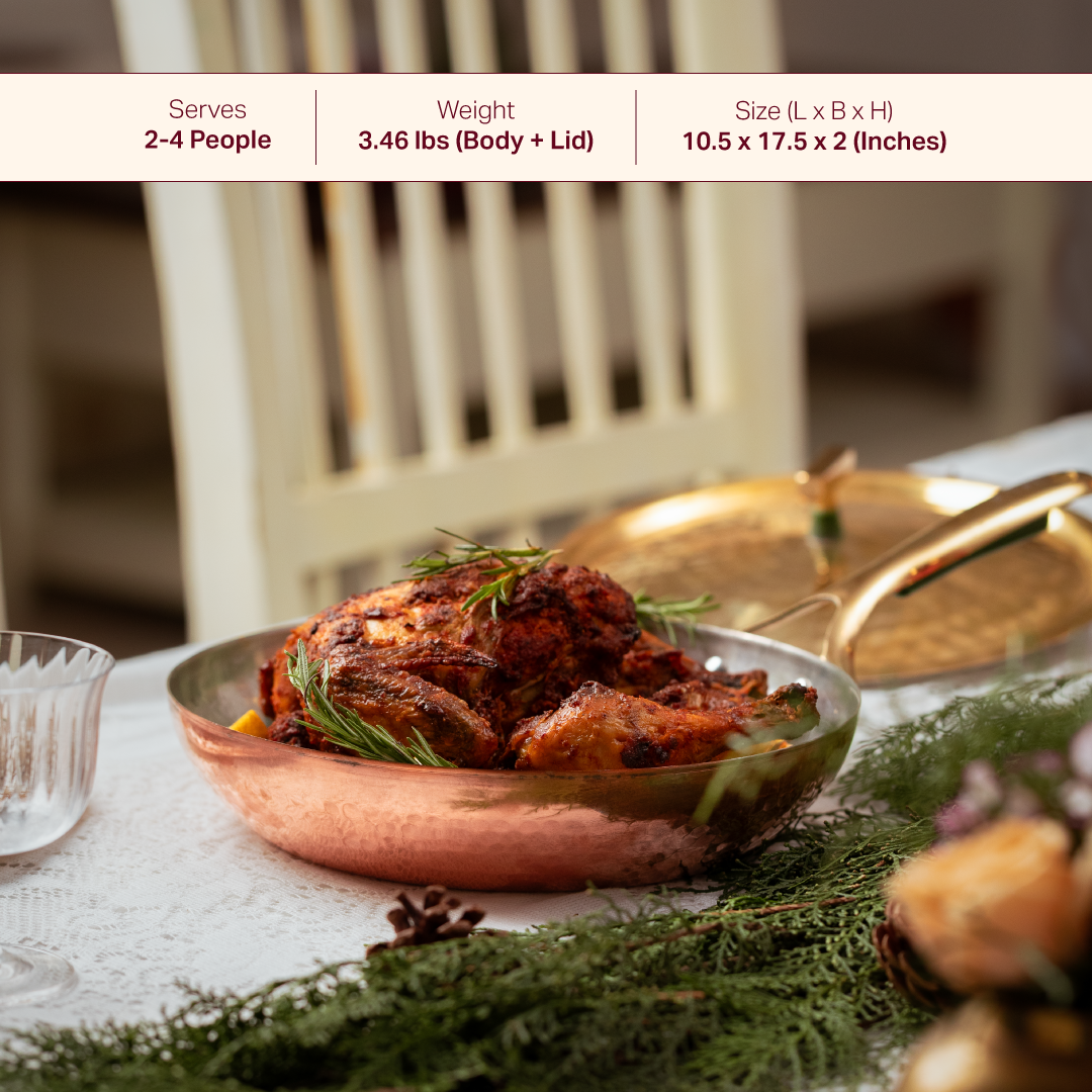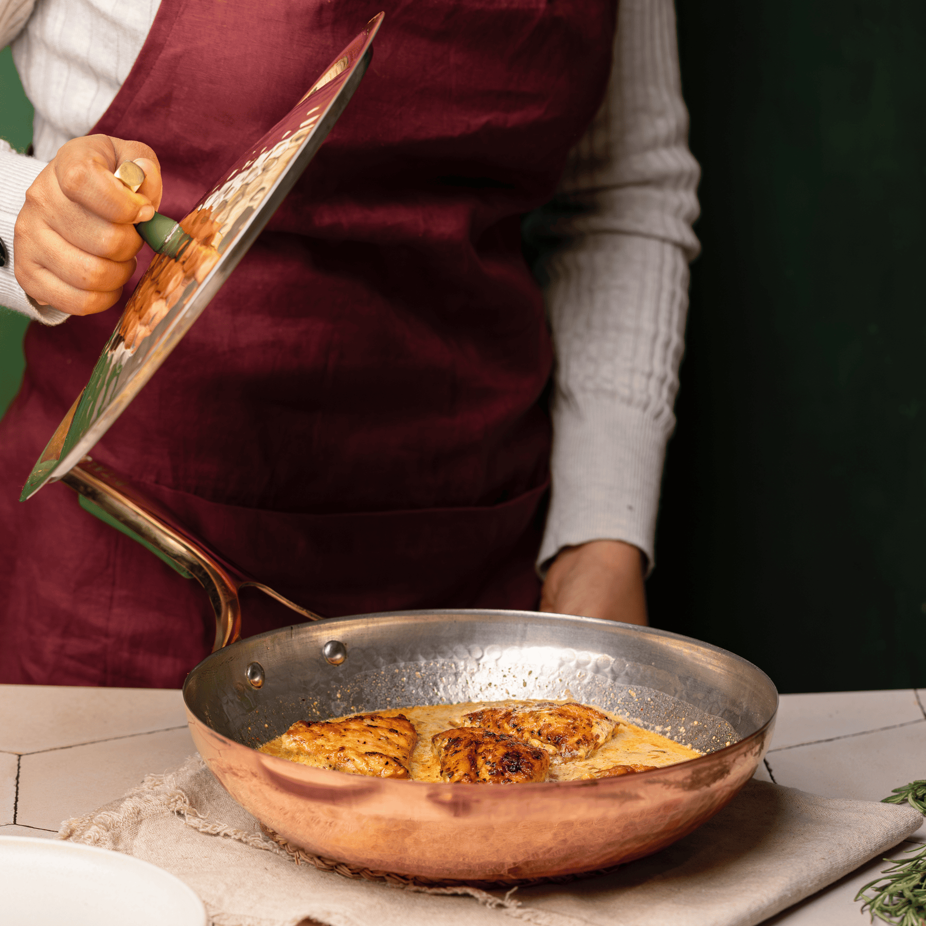Handcrafted in solid copper and lined with food-safe tin, this frying pan is designed for perfect searing, sautéing, and pan-frying. It heats up fast, distributes warmth evenly, and lets ingredients cook beautifully without sticking or burning.