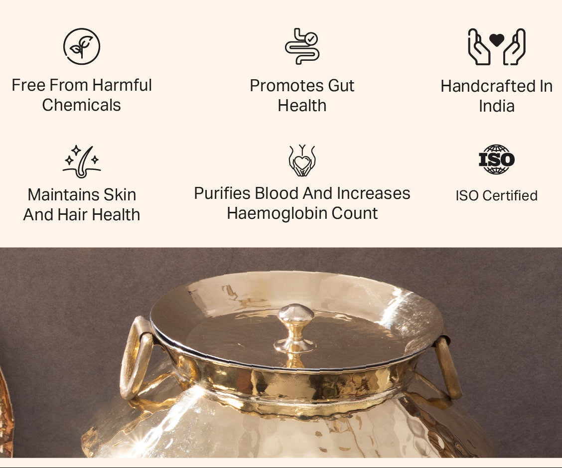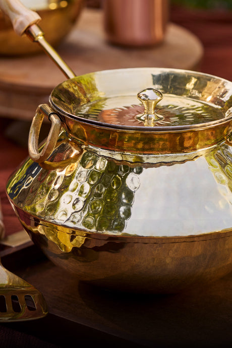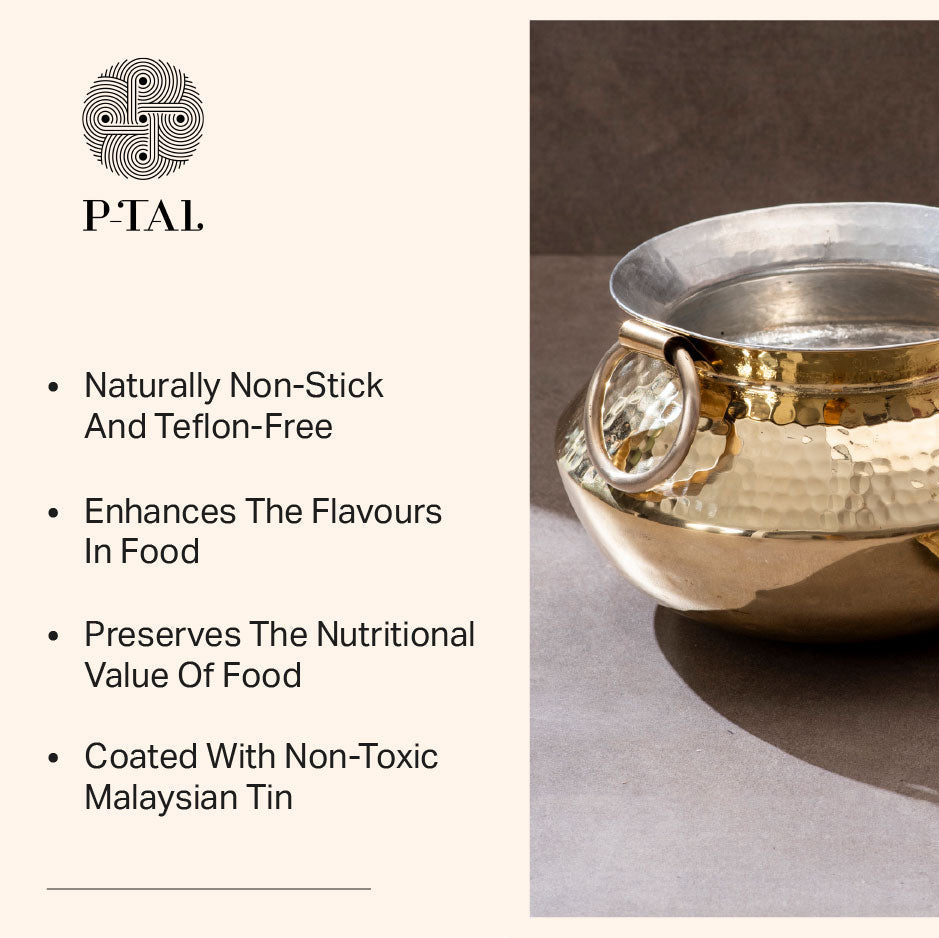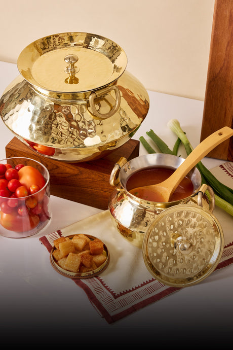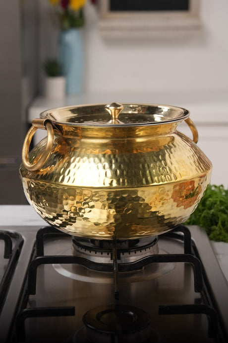 Cook with a classic brass patila /degchi/ soup pot to savor the ideal harmony between history and modern cuisine. Perfect for cooking anything from robust stews to delicious rice dishes, this adaptable cookware is well made to offer uniform heat distribution. Strong and beautifully crafted, it offers classic workmanship to your kitchen so that every meal honors flavor and tradition.