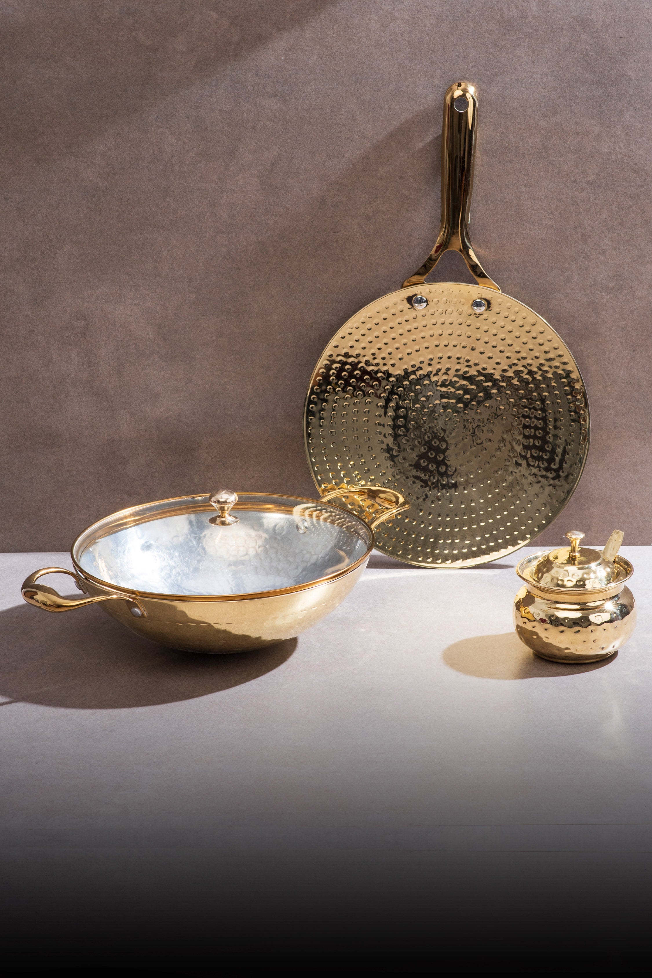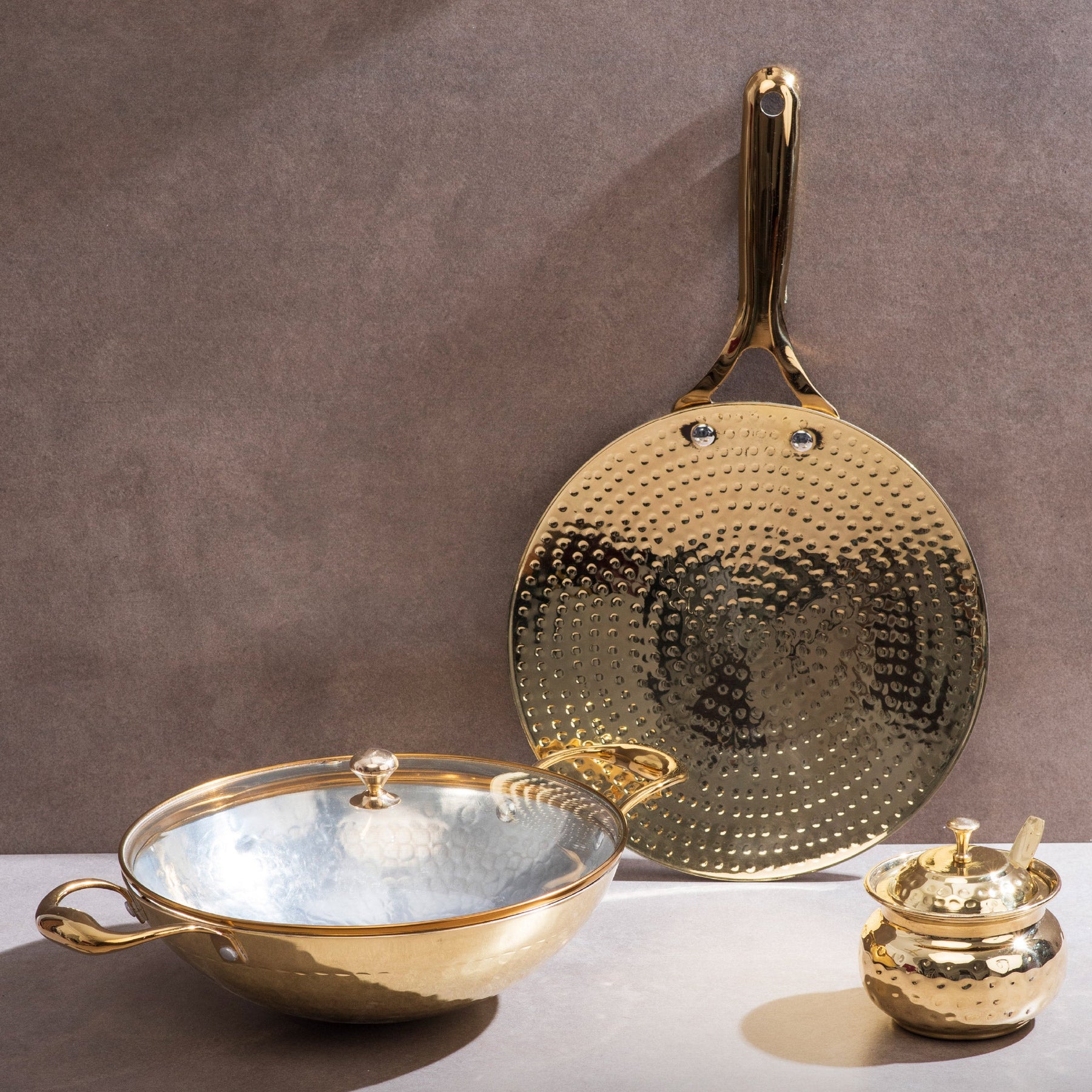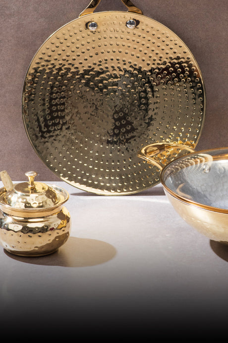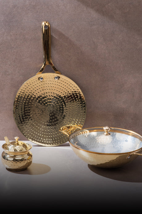 Each piece is handcrafted in pure brass with a warm golden finish. Together they bring the beauty of traditional Indian craft into a modern American kitchen and make everyday cooking feel a little more soulful and a lot more delicious.
