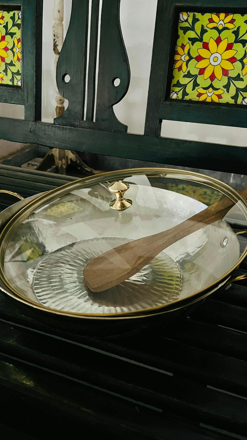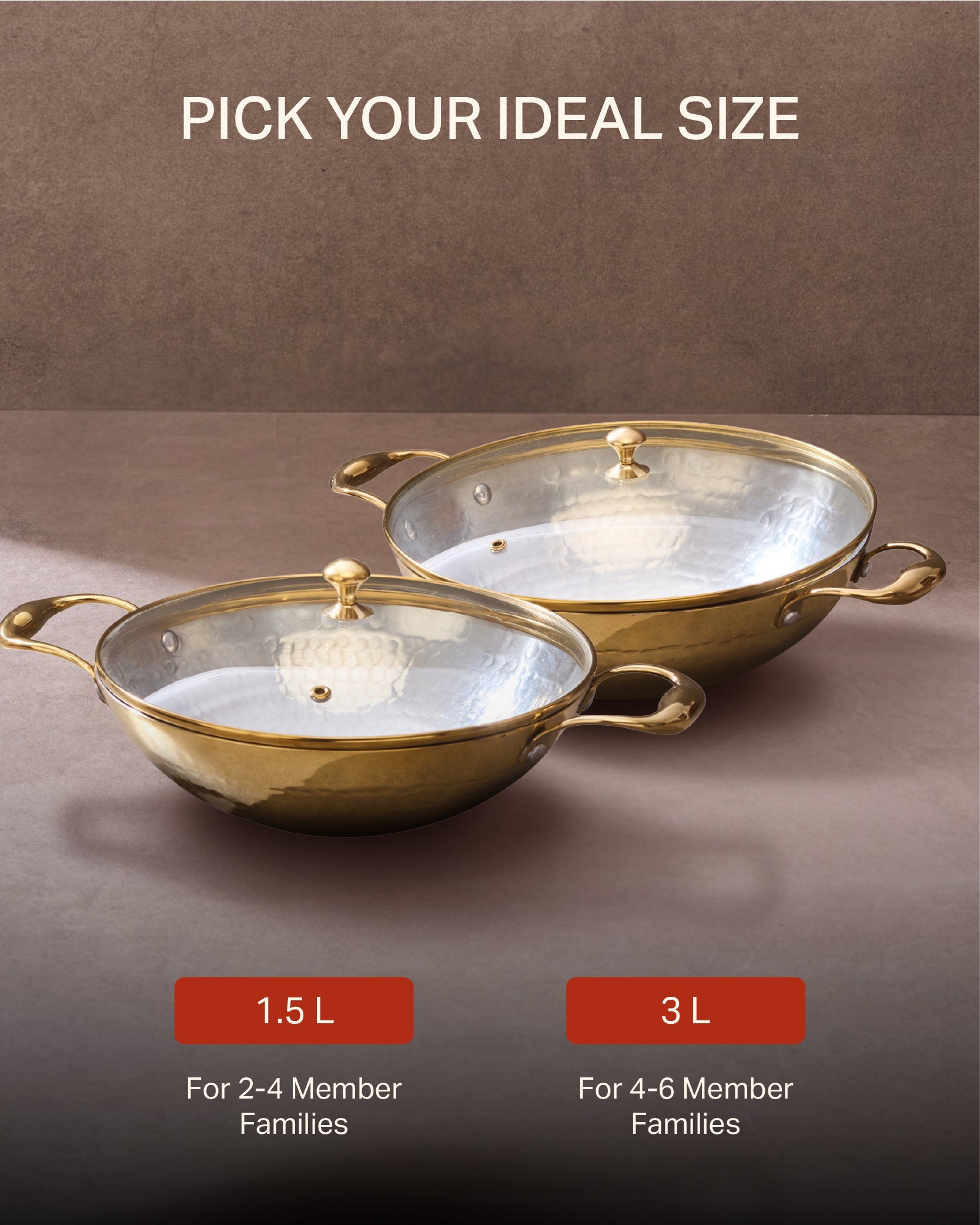 Brass Flat base Wok/ Kadhai, Glass lid, Free Spatula