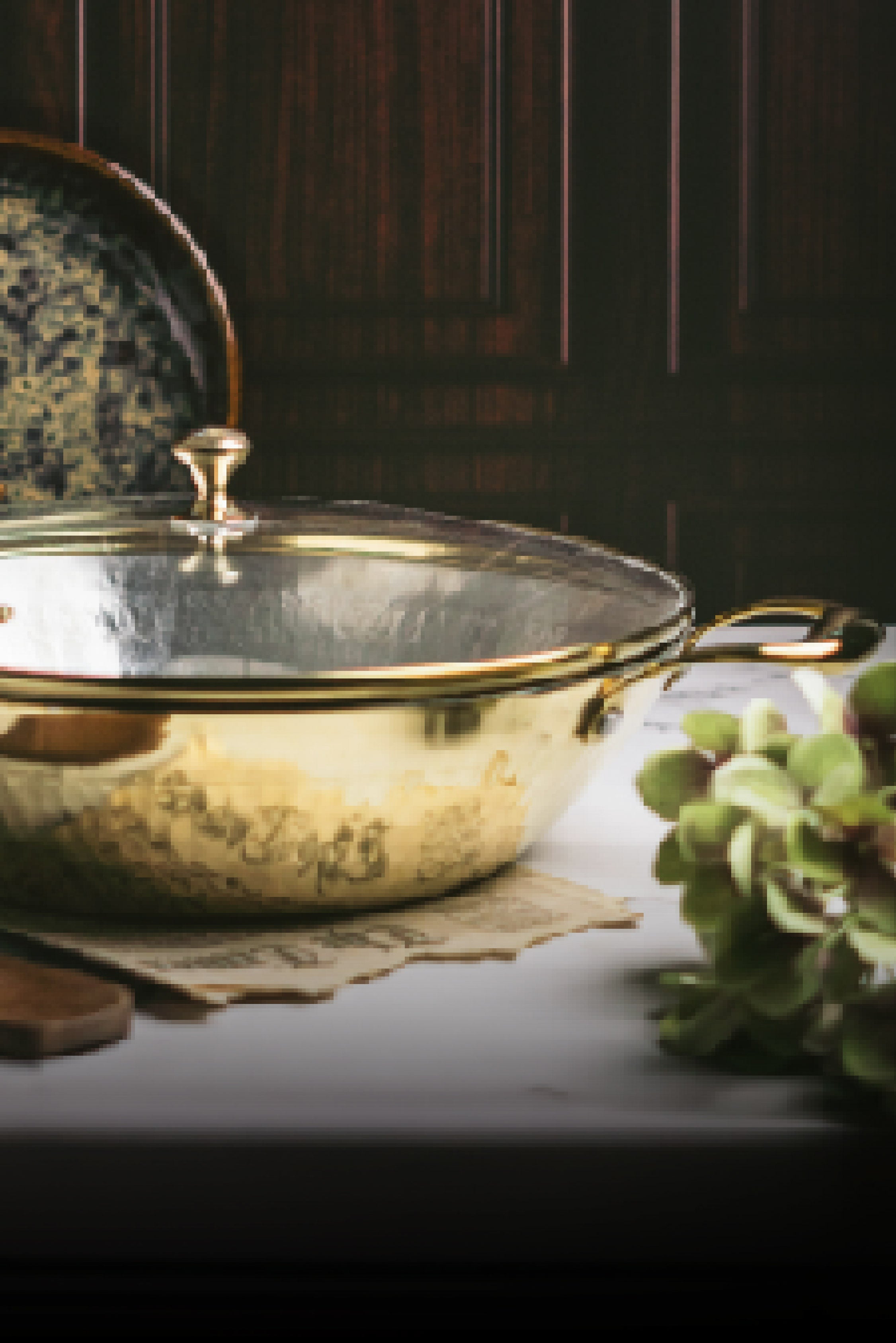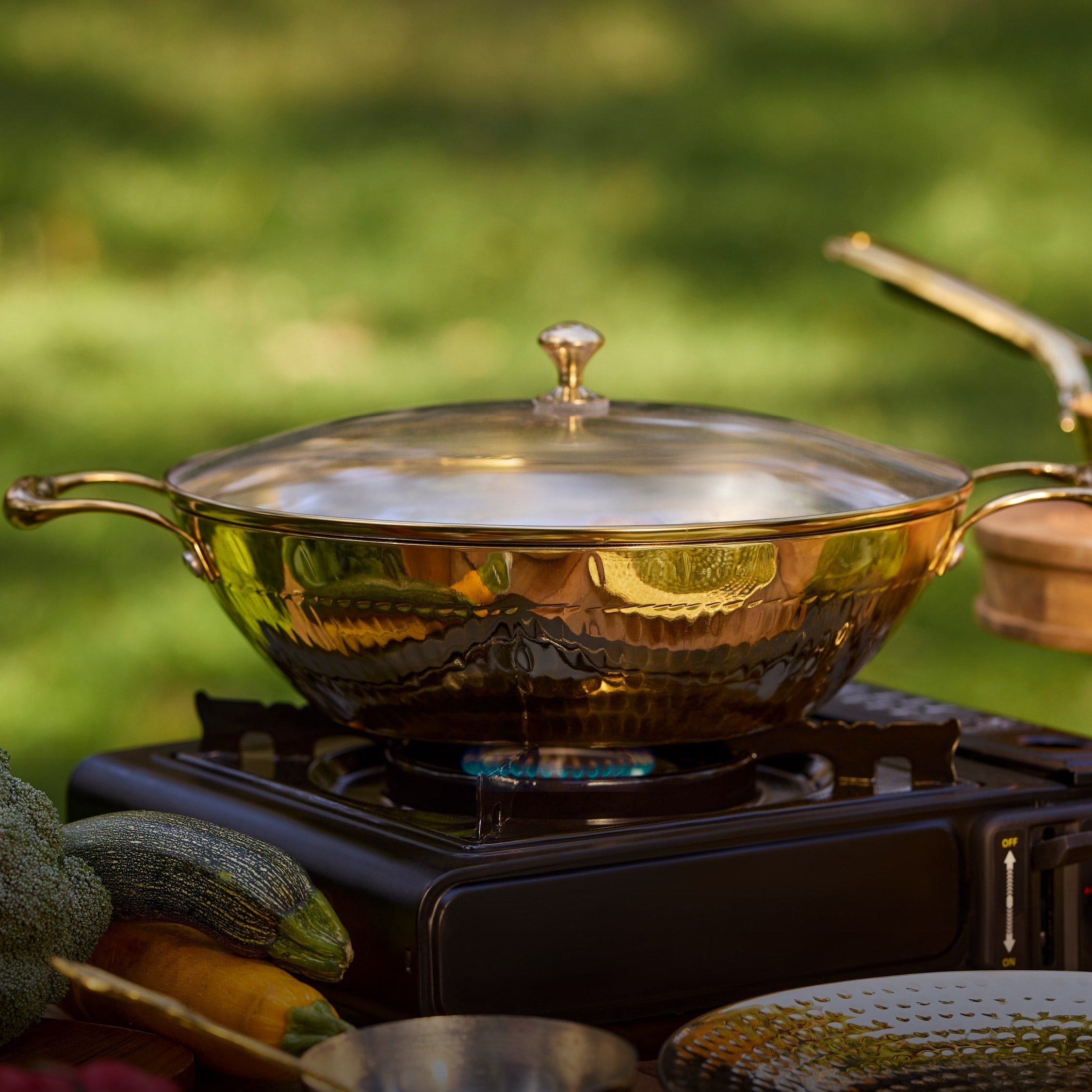 - Finish: Hand-hammered golden exterior; silver-toned tin-coated interior