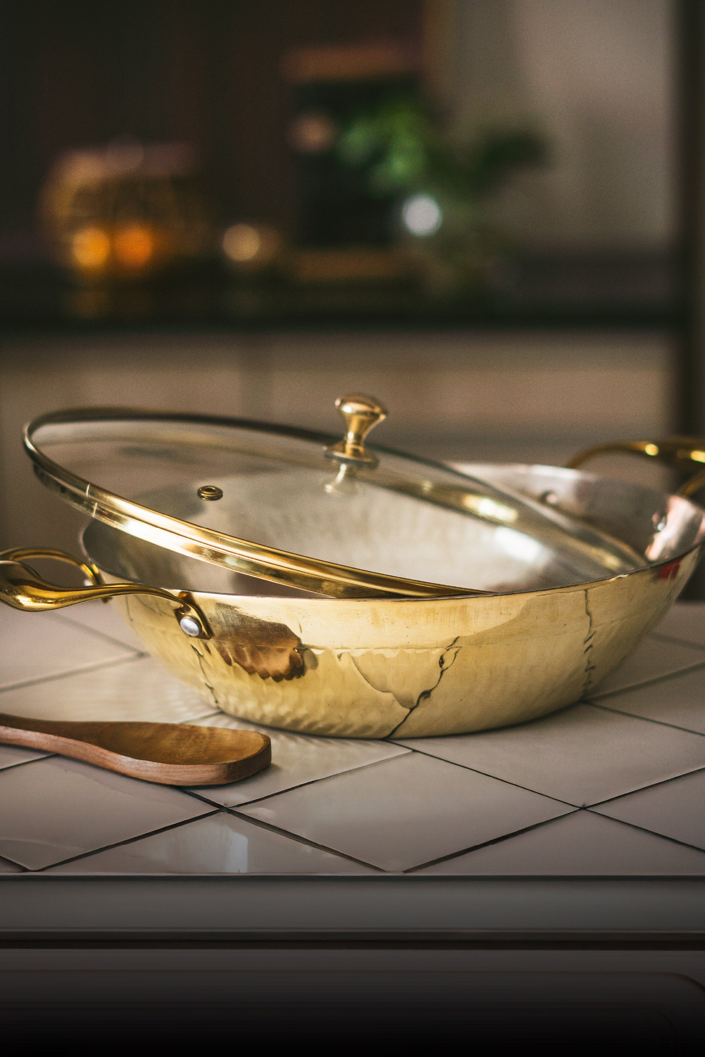 Brass Flat Base Wok with Glass lid - Kadhai (Deep & flat bottom cooking/serving utensil - karahi)