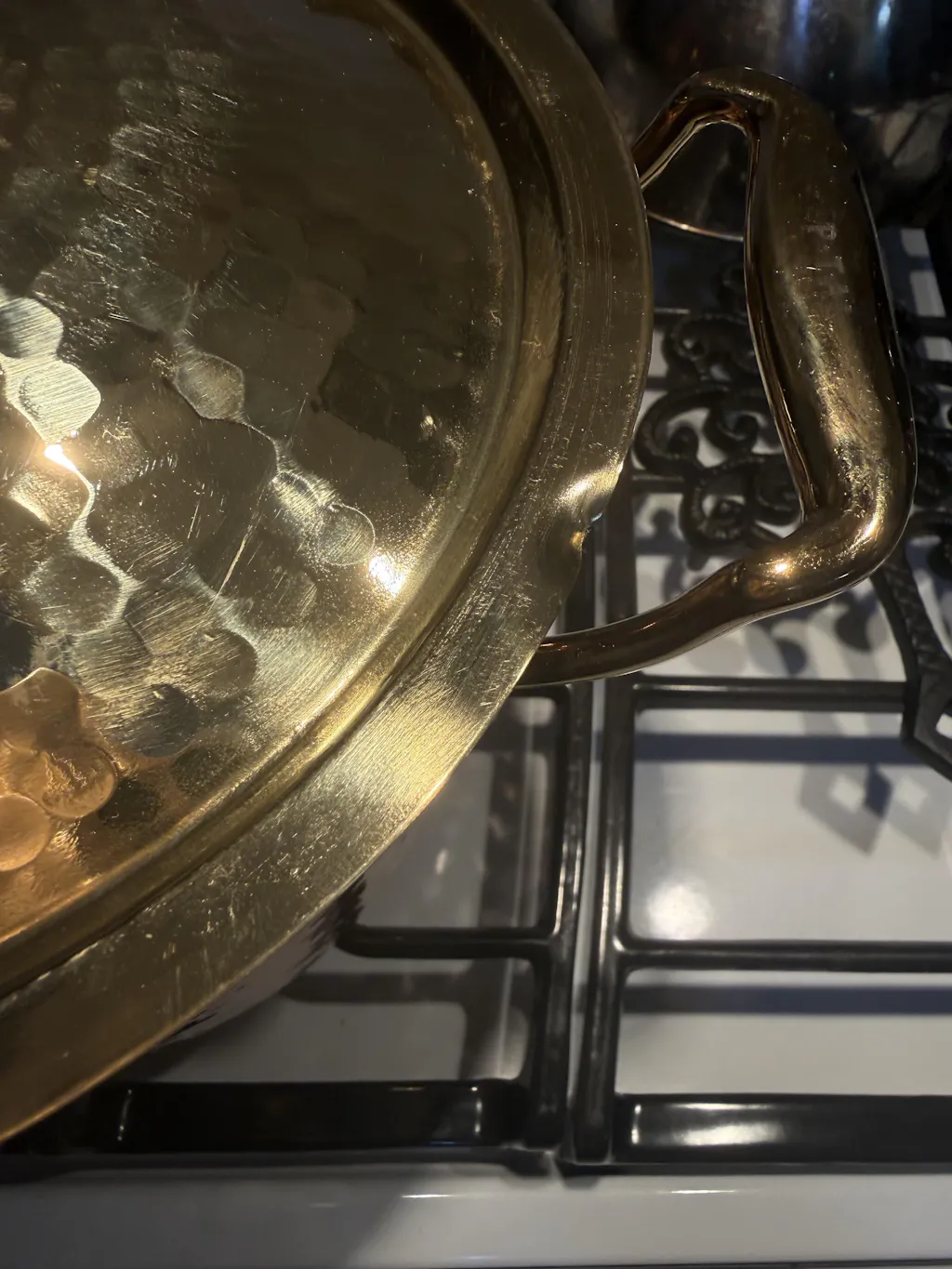 With sturdy side handles and a snug-fit lid, it moves easily from stovetop to table, keeping food warm while adding elegance to your serveware. The hammered rose gold finish gives it a touch of old-world charm that looks stunning in any kitchen.